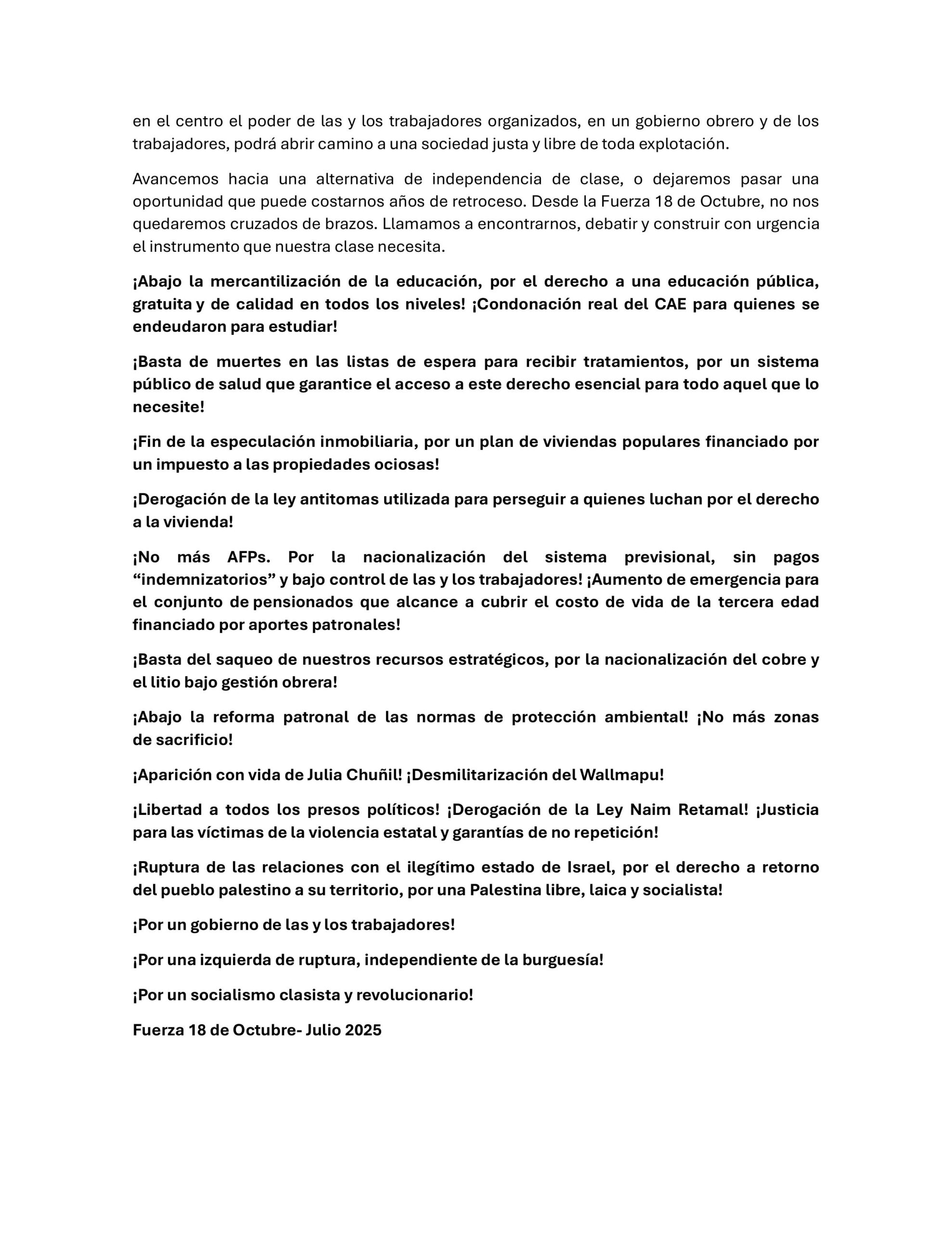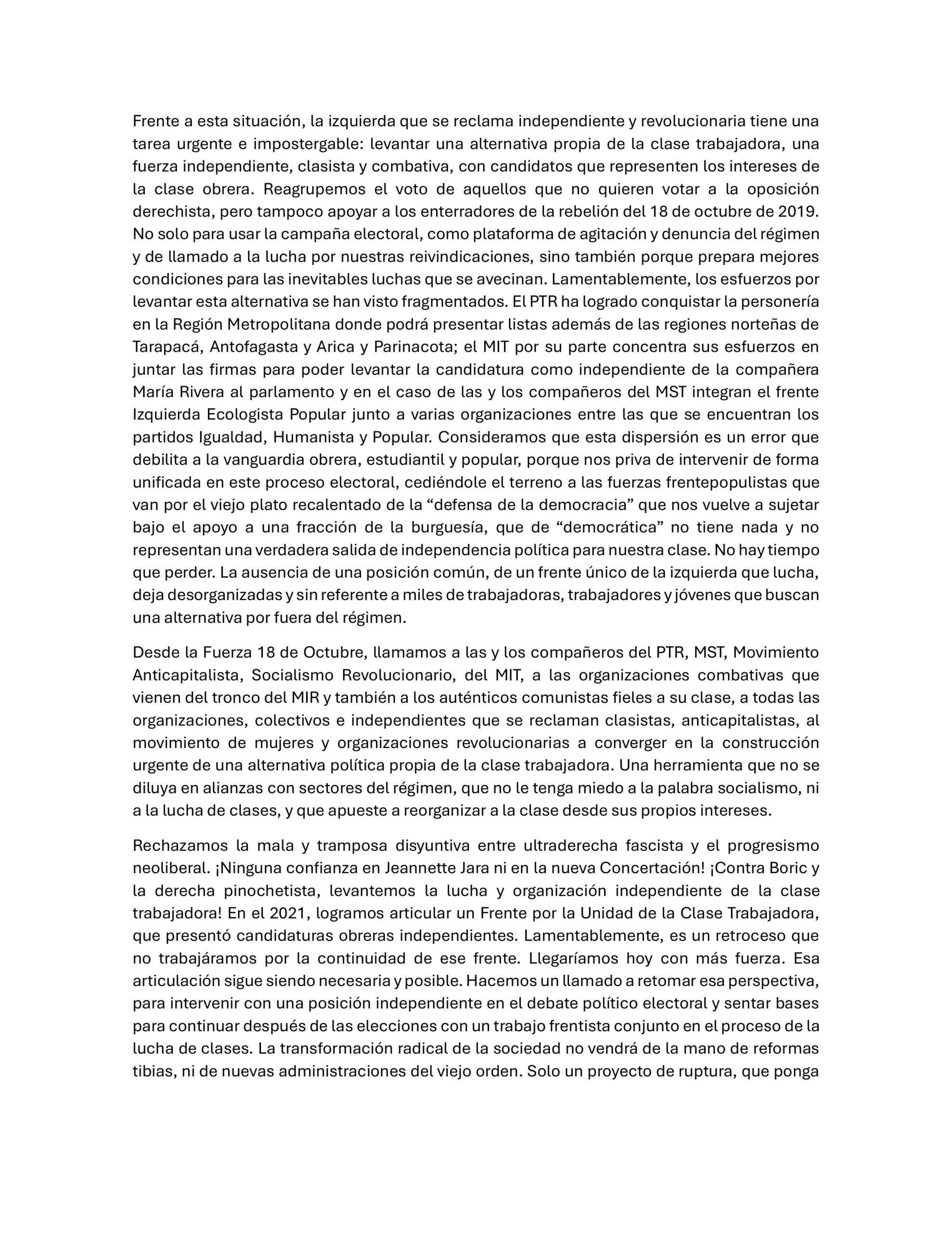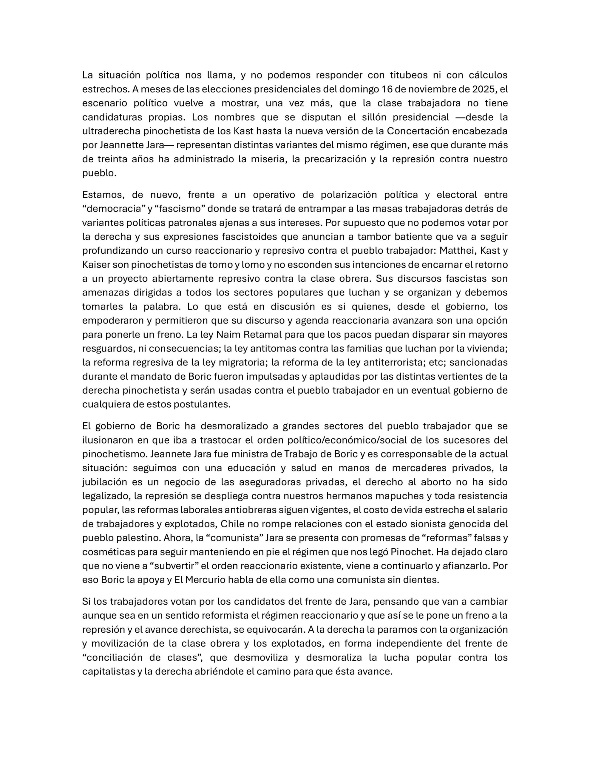 Mantenemos firme nuestra disposición a continuar el diálogo y el encuentro en todo esfuerzo común con todas las y los compañeros de las distintas fuerzas y agrupaciones revolucionarias e independientes de los gobiernos capitalistas. La campaña electoral debe servirnos no solo como plataforma de denuncia contra el régimen, sino también como espacio de organización y agitación en torno a las reivindicaciones inmediatas de nuestro pueblo, preparando mejores condiciones para las inevitables luchas que se aproximan. Aunque hoy llegamos fragmentados a esta etapa, el desafío sigue siendo reagruparnos en un bloque común que ponga en pie una verdadera alternativa de independencia de clase que luche y se organice por un gobierno de la clase obrera. Con esta convicción hacemos pública la carta que oportunamente hemos acercado a las diferentes organizaciones de la izquierda revolucionaria en nuestro país, dispuestos al debate fraterno de sus términos.